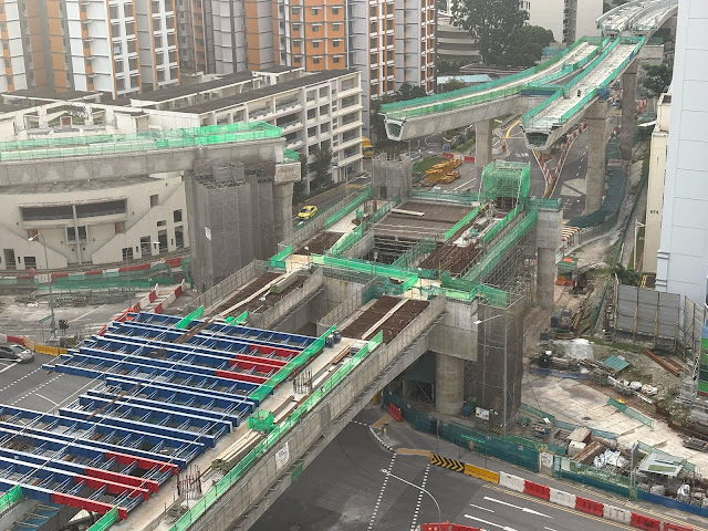 nutshell: Works were underway at the station's concourse level, with part of the works reaching up to the platform/trackbed level. The viaduct piers immediately south of the station had had the falsework set up to begin with installation of formwork for the crosshead. Over at the tail end of the line, the launch gantry had completed assembly of the sixth span, which would be lowered into place subsequently. Further viaduct piers towards the Pandan Reservoir station were at various stages of completion.
