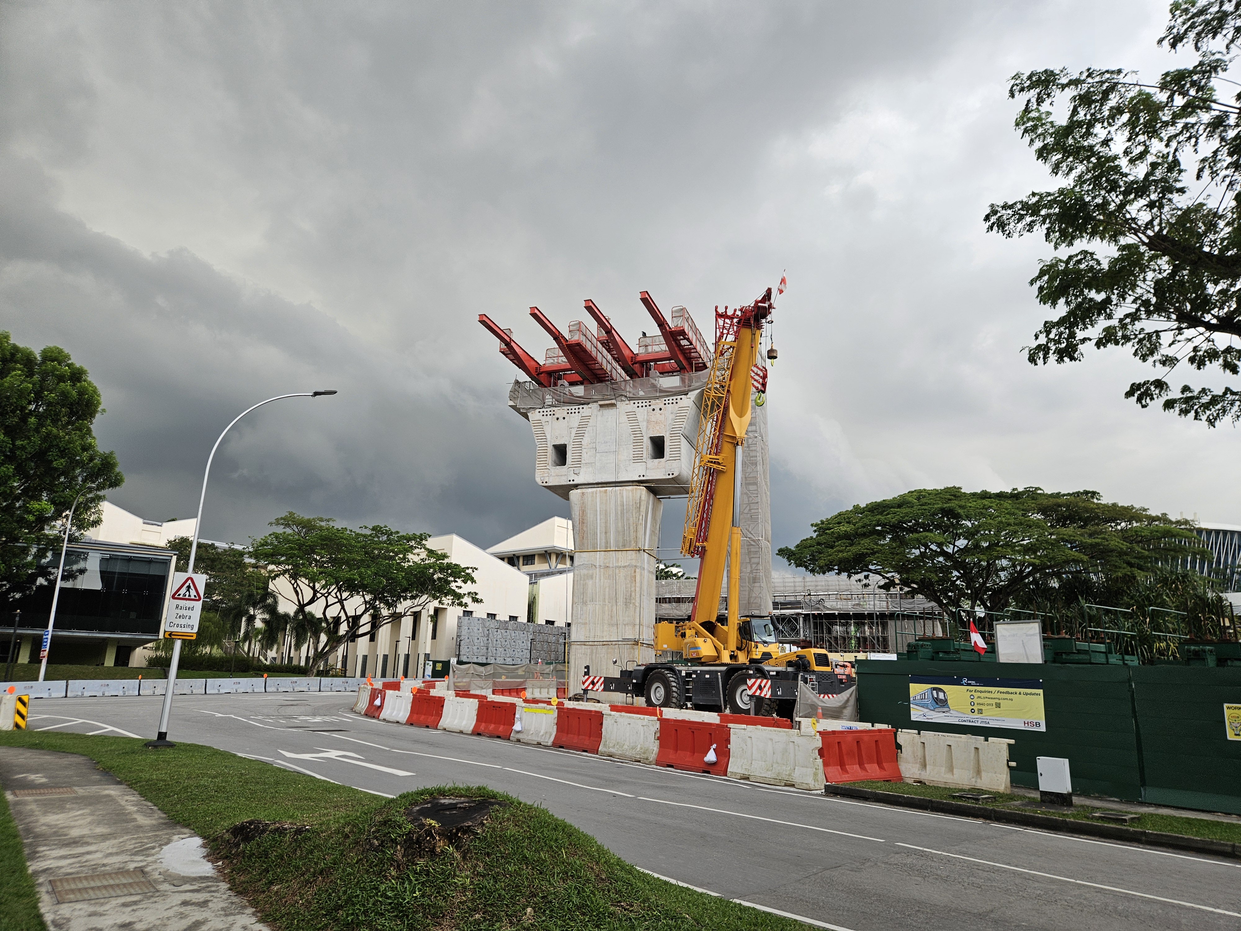In a nutshell: The previous 3 station piers have now become approximately 5, with a further 2 piers under construction. Precast crosshead segment launching was taking place for the second pier of the earlier three to be formed, near the southern end of the station. At the station's northern end, an additional viaduct pier had since been cast, with works set to begin on casting the crosshead shortly as well. Over across the Ayer Rajah Expressway (AYE), one viaduct span was since completed. Works were ongoing using lifting frames to complete a second span, approximately 2 segments in each direction away from completion.